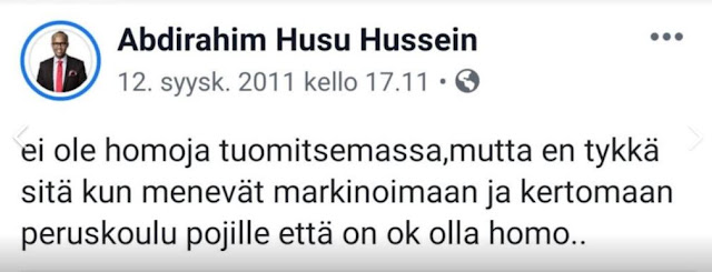 Asioiden saattamiseksi oikeaan valoon on myös vertailu paikallaan. Kun Martti Ahtisaaren CMI-rauhansovittelulaitoksessa työskennelleen ja sittemmin sosiaalidemokraattien riveistä kansanedustajaksi valitun Hussein al-Taeenin pyhimysmäisyys paljastui kaikessa karuudessaan, kävi ilmi, että hän oli laatinut härskejä vihakirjoituksia nettiin muun muassa homoista.