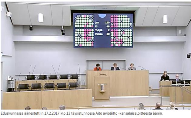Kansalaisaloite perinteisen avioliiton säilyttämiseksi hävisi eduskunnan suuressa salissa selvin luvuin, ja sukupuolineutraali avioliittolaki astuu voimaan 1. maaliskuuta.