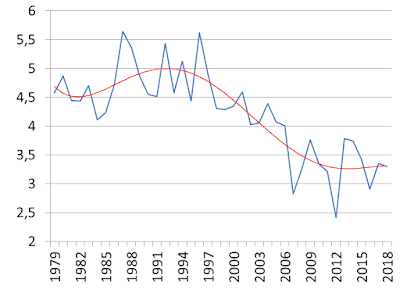 Nähtäväksi siis jää, onko napajään sulaminen alkamassa uudelleen noin puolen vuosikymmenen pysähtymisen jälkeen, kuten ilmastomallien perusteella on odotettavissa. Vai onko se sittenkin kääntymässä kasvuun, kuten yllä olevassa Excelin kuudennen asteen polynomin avulla piirtämä trendiviiva näyttäisi osoittavan.